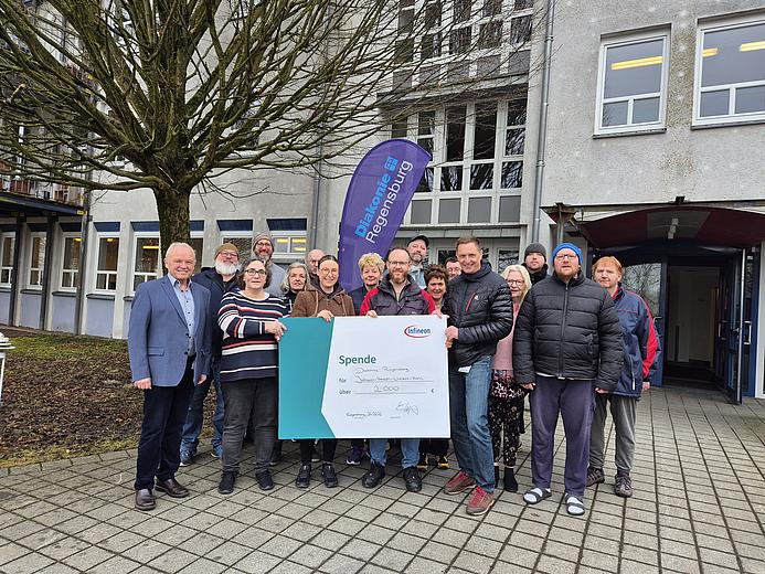 Den symbolischen Scheck nahmen Alexander Küblbeck und Johann Meier sowie eine Gruppe von Bewohnern der Einrichtung entgegen. Übergeben wurde er von Kristina Müller, Dieter Marschalt, Christopher Weiß und Johann Dechant stellvertretend für die Belegschaft von Infineon.