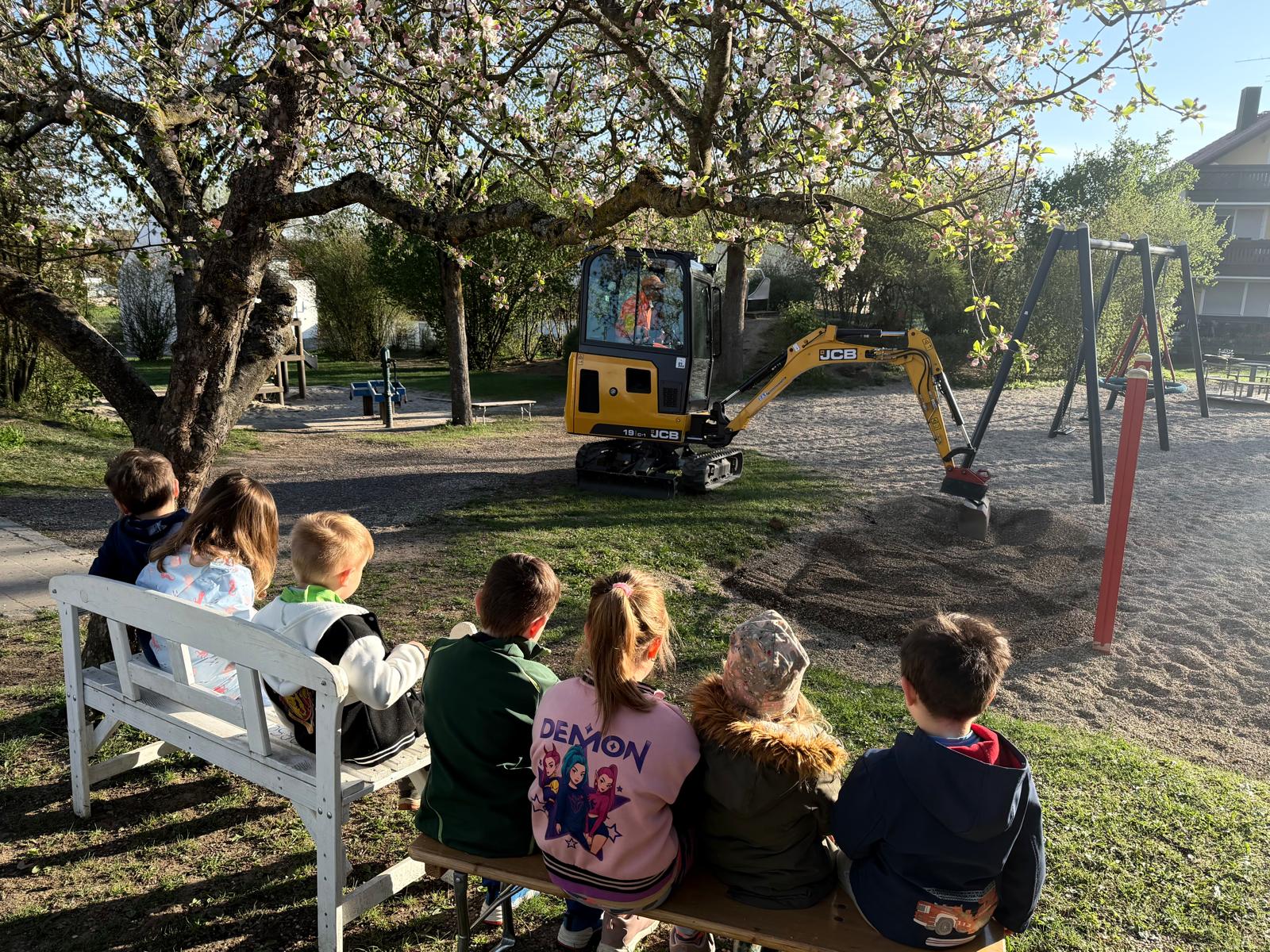 Während der Bauhof fleißig mit dem Minibagger den Kies aufgelockert hat, haben es sich sieben kleine Zuschauer ganz gemütlich auf der Bank unter unserem blühenden Apfelbaum bequem gemacht.